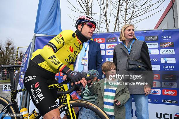 HARELBEKE, BELGIUM - MARCH 28: Wout Van Aert of Belgium and Team Visma | Lease a Bike meets his son Georges Van Aert and wife Sarah De Bie prior to the 68th E3 Saxo Bank Classic - Harelbeke 2025 a 208.8km one day race from Harelbeke to Harelbeke / #UCIWT / on March 28, 2025 in Harelbeke, Belgium. (Photo by Tim de Waele/Getty Images)